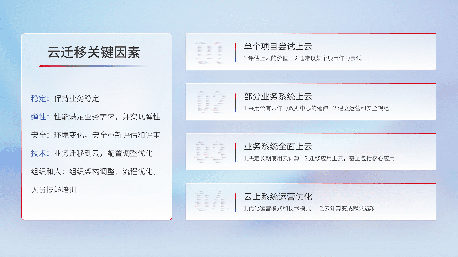结合实际业务,,从规划设计、、、云平台选型、、、、云原生改造、、、、数据迁移、、、集成交付,,迁移全过程为客户识别最佳上云路径,,,做好风险识别管理,,,设计网络架构、、身份权限、、安全审计合规、、、、操作审计、、、日志审计、、监控告警策略、、、多站点容灾设计等,,,对云上基础设施进行整体规划,,,提升IT治理水平,,,以满足弹性、、、、高可用、、、、高性能的需求。。。