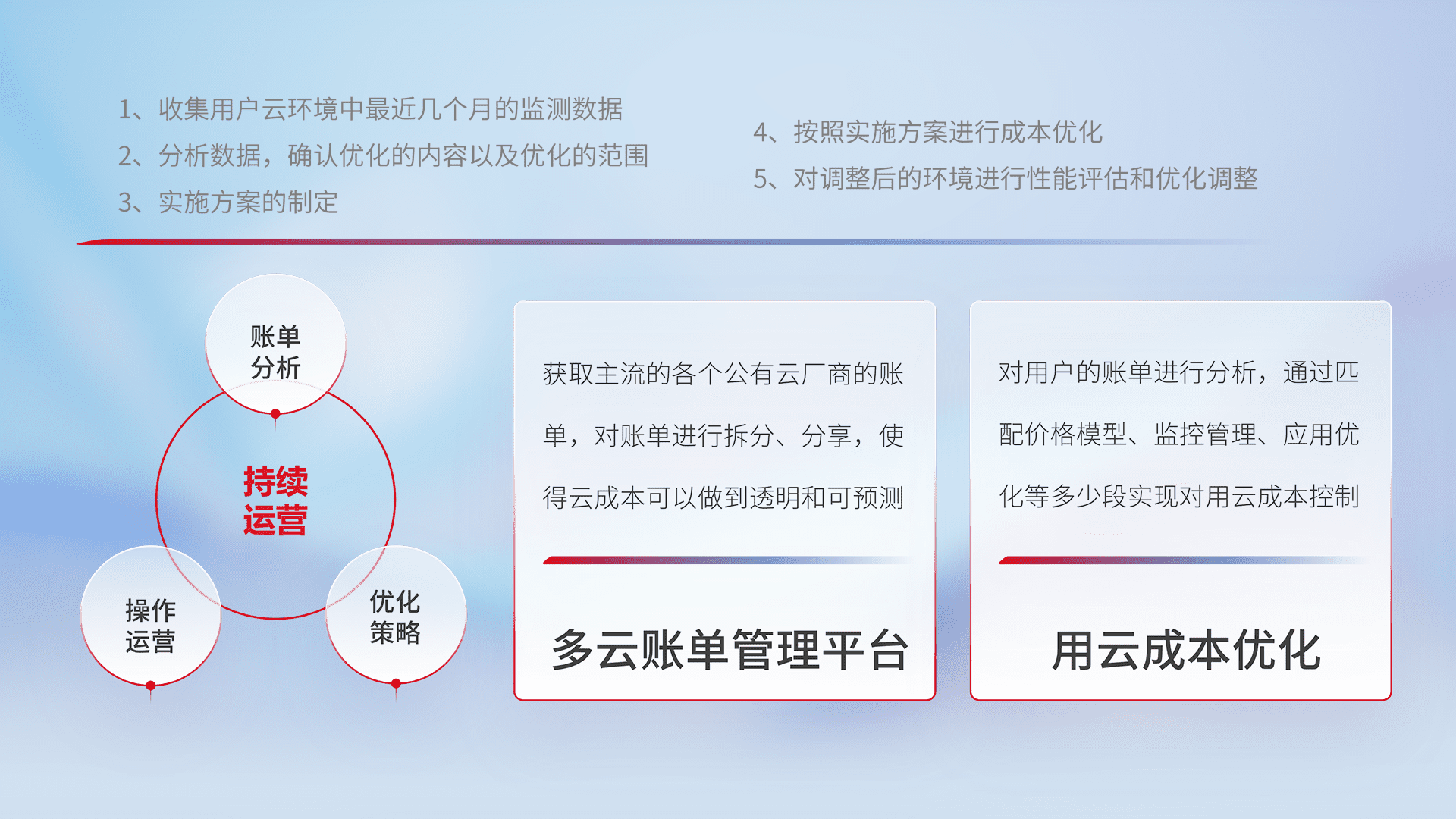通过多云纳管,,,,以统一的资源数据模型把客户的云资源进行抽象和封装,,,进而实现对多云资源的统一操作,,,,保障云资源管理的可靠性、、、、稳定性与可用性。。量身定制化运维内容,,,,配置、、、开发运维、、、补丁管理、、、备份、、、监控、、、认证和访问管理、、、审计和日常巡检等,,保障在用云过程中的可靠度,,稳定度以及高可用率。。